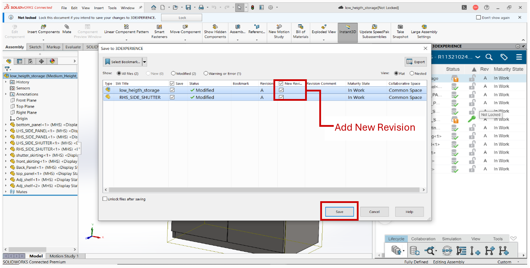 • Click on the Save with Options to save the part and assembly and click on New Revisions to add revisions and click Save.
