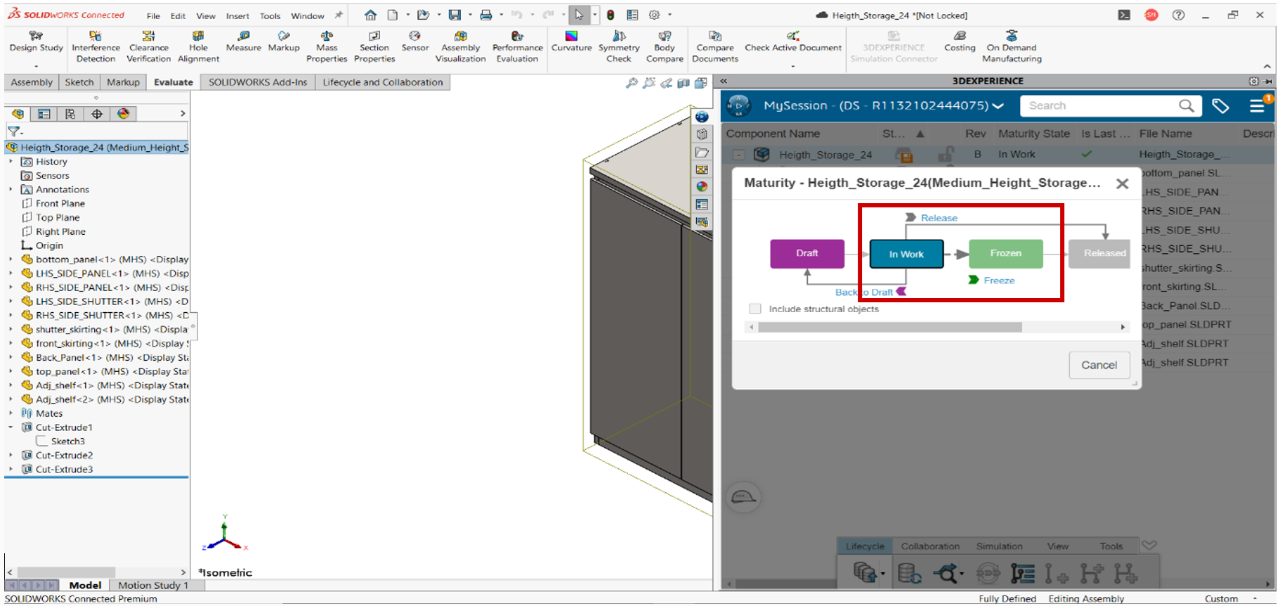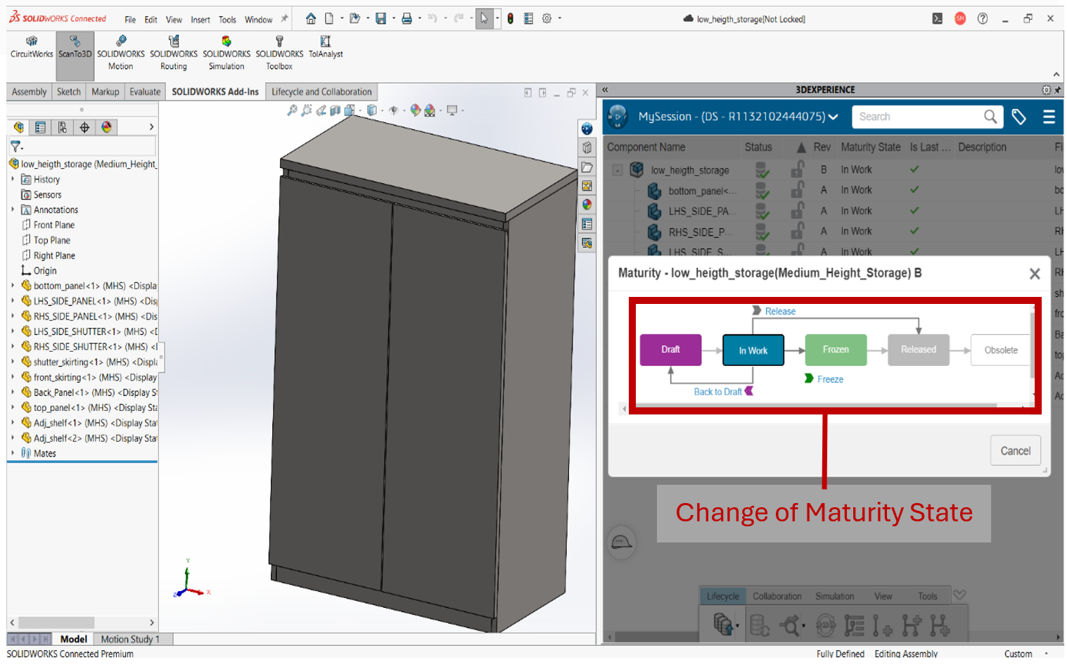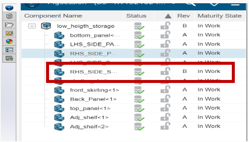 Open the part model or assembly that is to be changed using SolidWorks connected. On the task pane tab, we can that the connected model with its maturity state, revision, component status etc. we can also change the maturity state and add revisions within the SolidWorks.