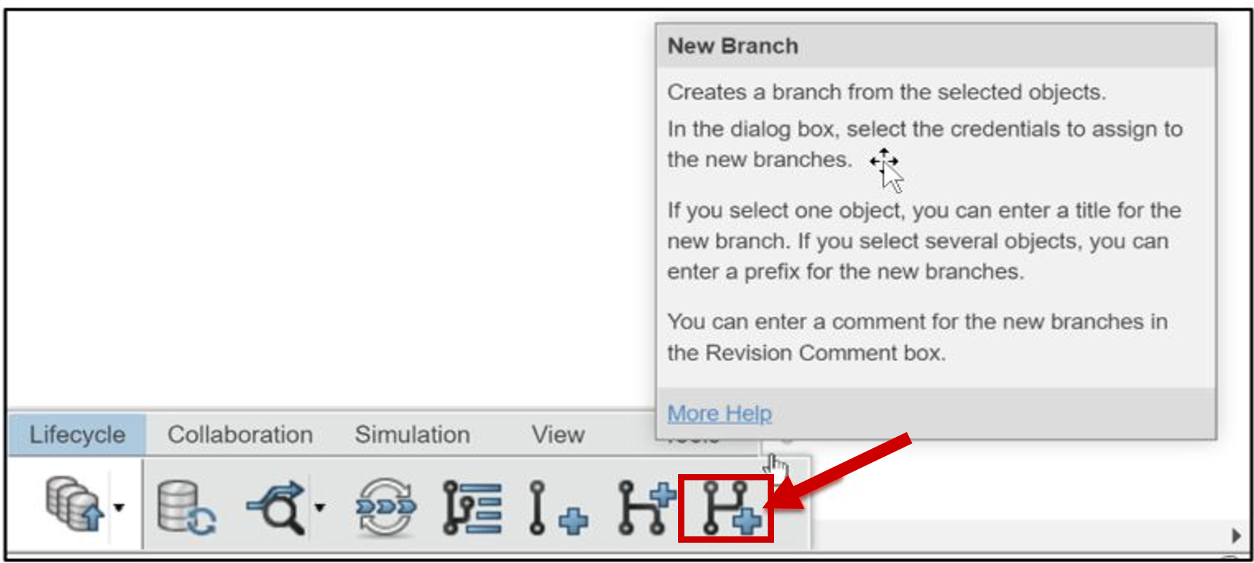 New Branch: Creates a new branch from the selected object. In the dialog box, select the credentials to assign to the new branches. If you select one object, you can enter a title for the new branch. If you select several objects, you can enter a prefix for the new branches. You can enter a comment for the new branches in the Revision Comment box.