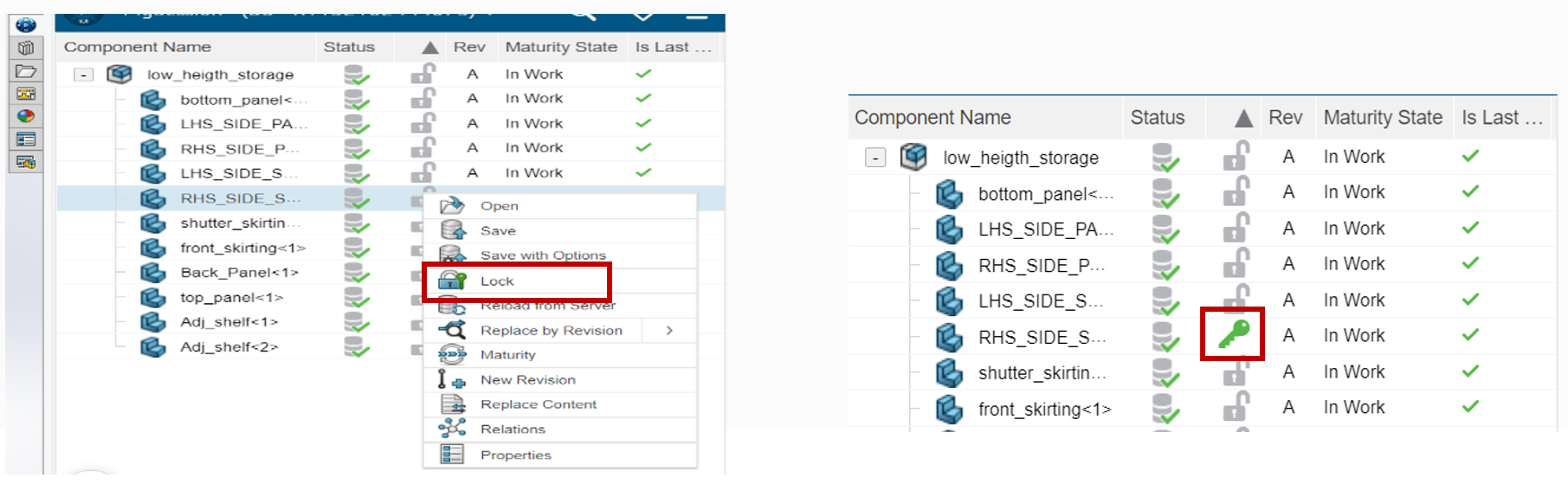 • Right click on the part which is to be changed and click the Lock option, this will automatically lock the part.