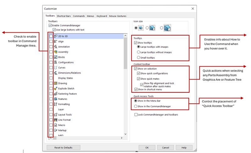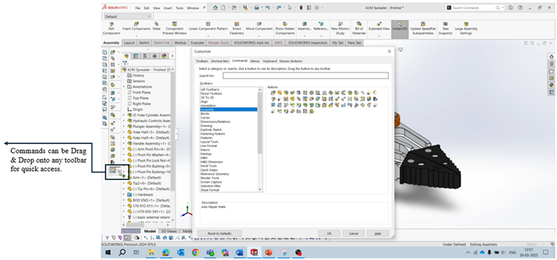 The Commands tab in the Customize menu lets you browse & organize all available SOLIDWORKS commands, grouped by category. From here, you can Drag & Drop commands directly onto Toolbars, Menus, or the Command Manager.