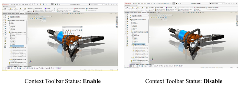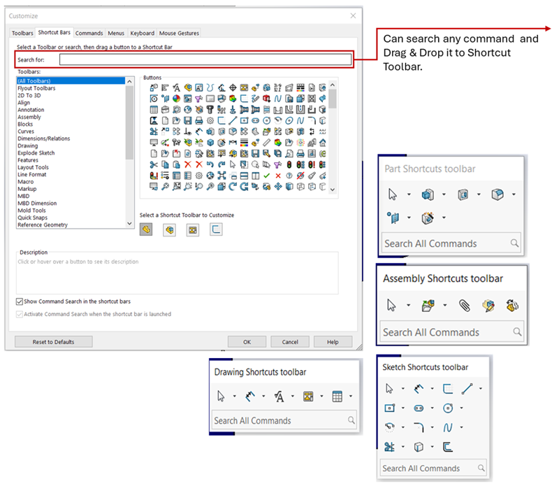 The Shortcut Toolbar pops up when you press “s” key & enables you to quickly leverage command based on environment i.e. Part, Assembly & Drawing. You can populate it with your top 12–16 frequently used commands for instant access.