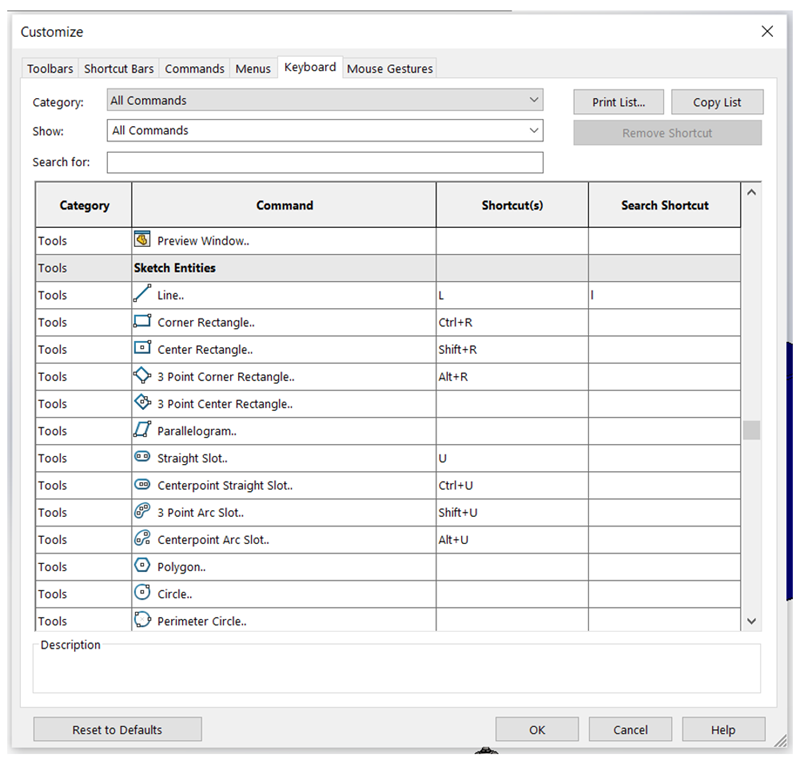 The Keyboard tab allows you to assign or reassign keyboard shortcuts to any SOLIDWORKS command. You can filter commands by name, then select a command and press the key combination you’d like to use.