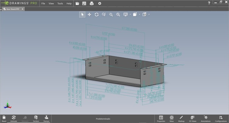 3D PDF can be viewed using a variety of free tools including Adobe Reader. In addition to providing associative information such as engineering notes, BOM, and rich Meta properties, you can also explore the model in 3D with Pan, Zoom, Rotate, Measure, Section, and other 3D tools using the eDrawings.