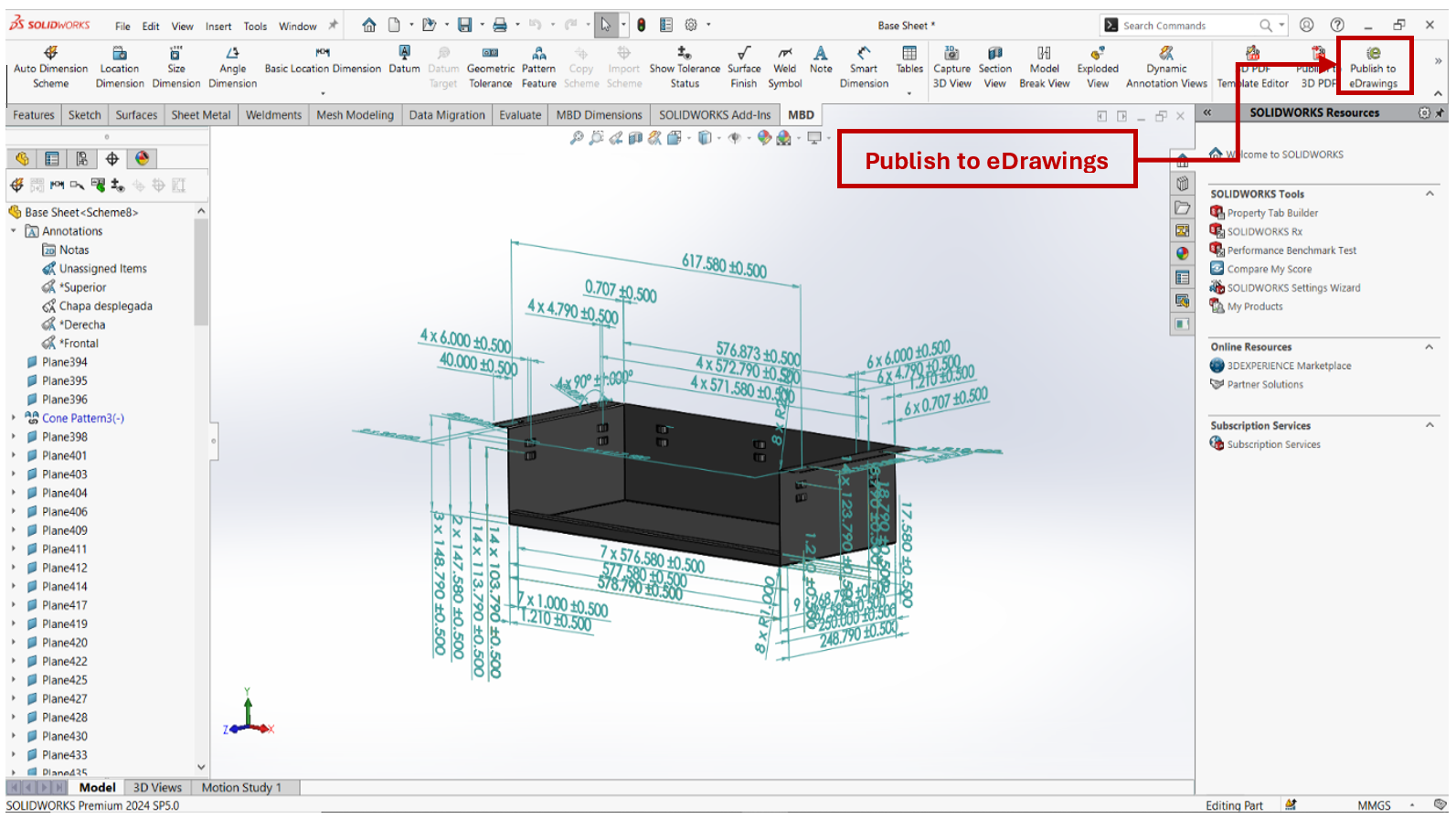SOLIDWORKS MBD revolutionizes the way product information is communicated by enabling the direct publication of 3D PDFs and eDrawings. Whether you're sharing models with internal teams, external suppliers, or quality control departments, MBD ensures that everyone receives the exact data they need—accurately and efficiently.