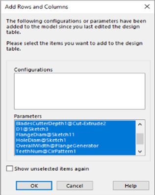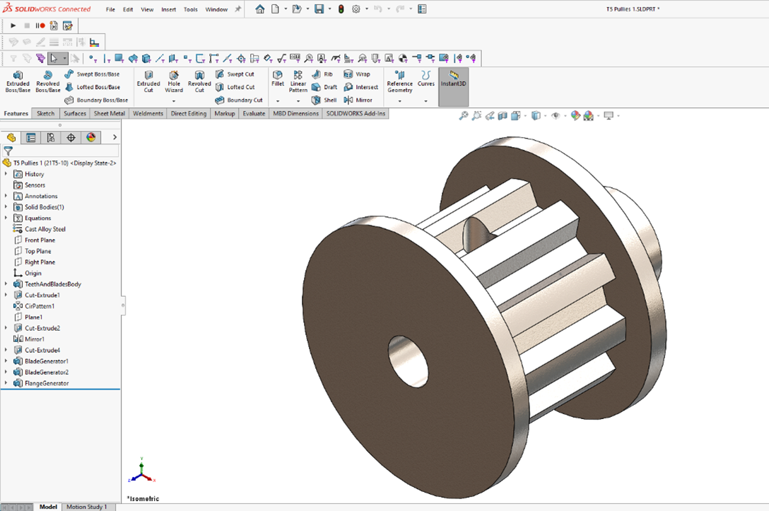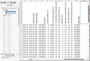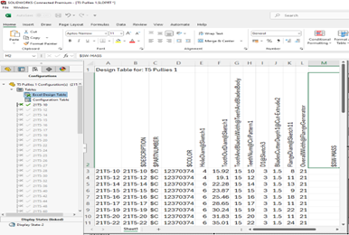 Imagine designing a series of pulleys (e.g., TS Pulleys 1. SLDPRT) where each configuration varies by the number of teeth and blades, with mass being a critical factor for performance analysis. Manually updating the mass and dimensions for each configuration is time-consuming and error prone. The ideal solution is to automate this process using a Design Table linked to $SW-MASS.