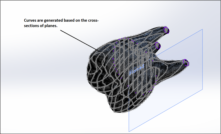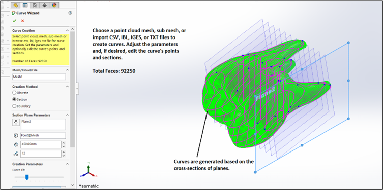 Another useful feature within Scanto3D is the Curve Wizard, designed to assist in generating profile curves for subsequent Loft feature creation. To control the location and characteristics of the curves, the Curve Wizard incorporates options for Sections, Section Plane parameters, and Creation Parameters.