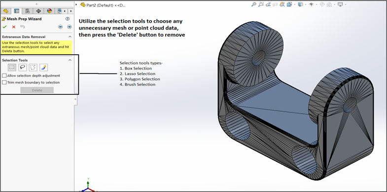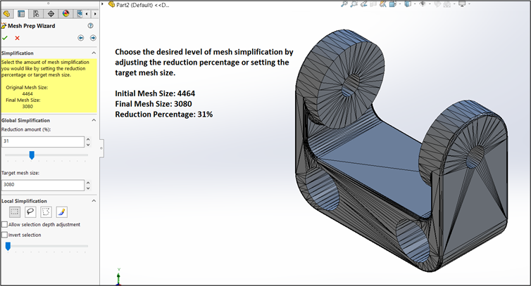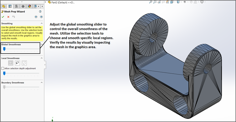 Within the Mesh Prep Wizard, you'll find tools designed to modify the original mesh data, enabling you to relocate it and eliminate unnecessary data points. Additionally, you can fine-tune the mesh data through global and local settings for Simplification and Smoothness.