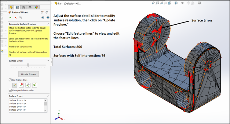The automatic creation feature employs a one-step procedure to generate a solid model directly from the mesh. This option is particularly well-suited for anatomical and organic shapes. Within the Automatic Surface Creation interface, depicted below, you can specify the desired surface intricacies and fine-tune feature lines. Additionally, you can delete existing feature lines, generate new ones, and refine feature lines for smoother contours.