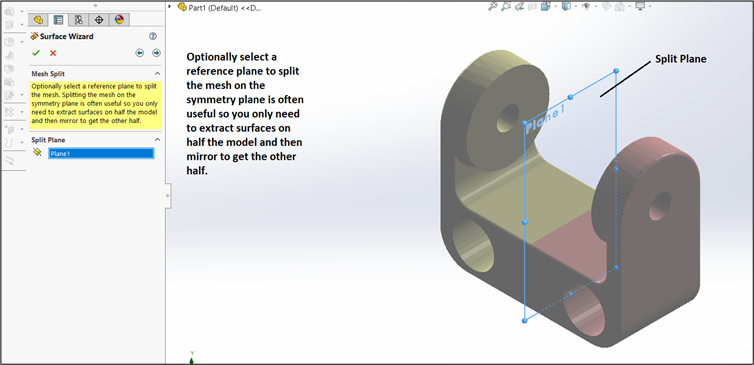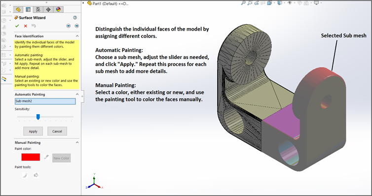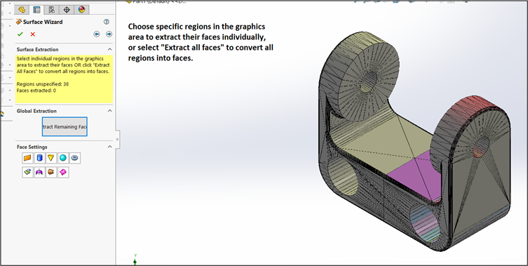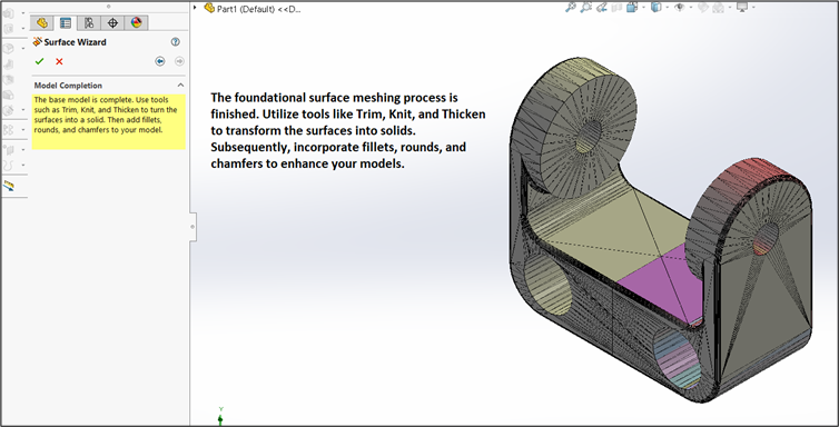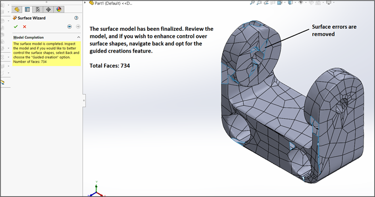 Guided creation employs a multi-step approach for surface generation, which proves beneficial for analytical surfaces or when precise control over the surfaces is desired. This option provides additional functionalities compared to Automatic creation, such as the capability to split the body, particularly useful for scenarios like Molds. Additionally, Guided creation facilitates surface painting, enabling finer details in the final model.