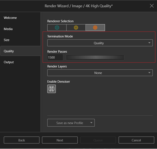 Specify the essential format of your render within the wizard, whether it's a PNG, BMP, JPEG and etc or a sequence of animations. Choose the size and quality of your output, as these factors will directly affect the rendering time and final quality.