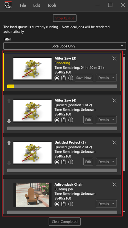 After sending your job to the queue, you’ll see a detailed menu listing all the queued jobs. Here, you can manage the queue by starting, pausing, or stopping jobs. Each job's status is clearly indicated: green for completed tasks, yellow for those currently rendering, and no color for jobs waiting their turn.