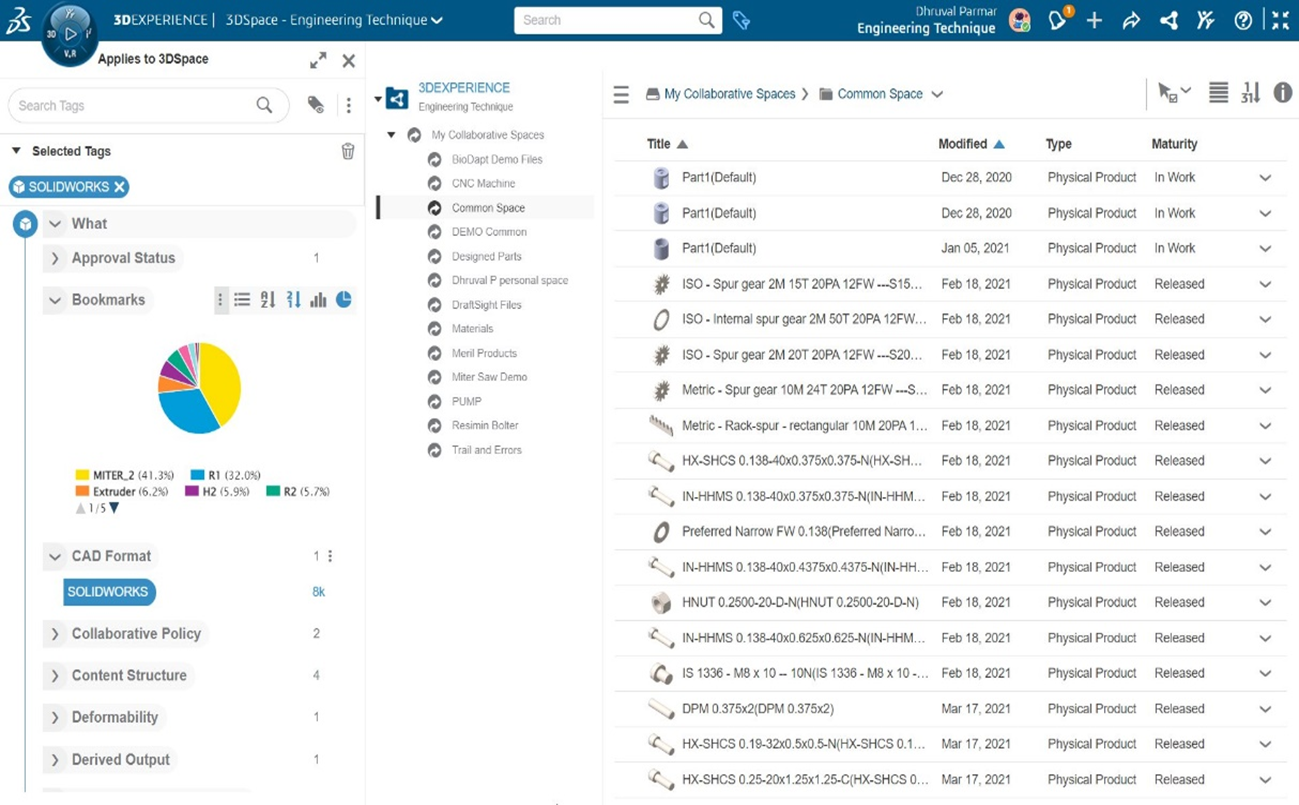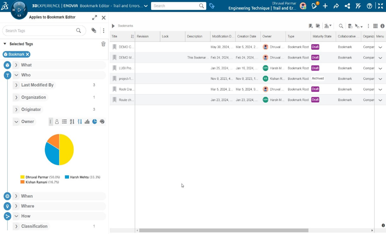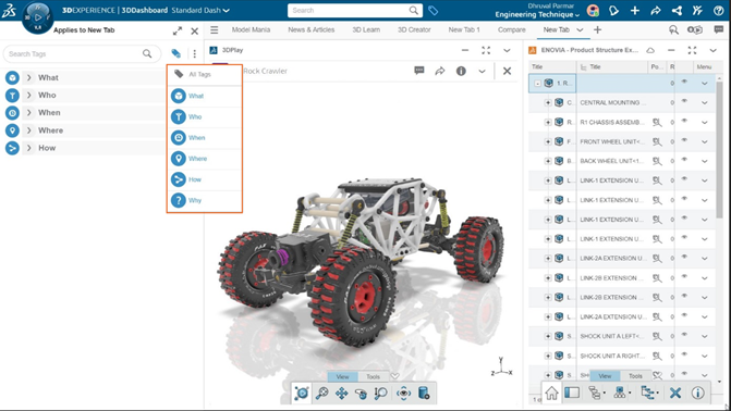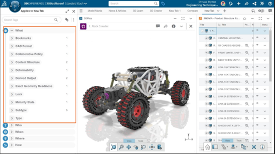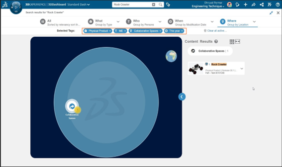 Whereas in Collaborative Spaces, 6W Tags function similarly by filtering information based on criteria like location, approval status, and CAD format. This versatile feature isn't limited to specific apps but is applicable across almost every application within the 3D Experience Platform
